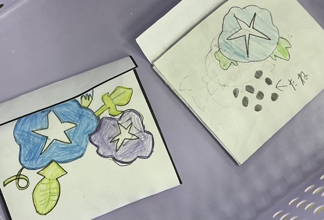 袋は一人一人が手作りし、アサガオの絵やメッセージを書きました。
