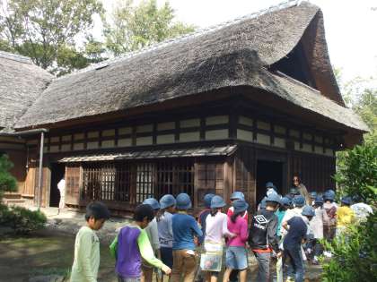 次の見学場所は「一之江名主屋敷」です。一之江名主屋敷は江戸時代初めここへきて新田を開発した田島家の居宅です。江戸時代を通じて一之江新田の名主を務めてきました。現存する主屋は約240年前に建てられたものだそうです。茅葺き屋根の曲り屋で周囲に堀をめぐらせて屋敷林、屋敷畑、庭園もあり中世土豪風の屋敷構えです。