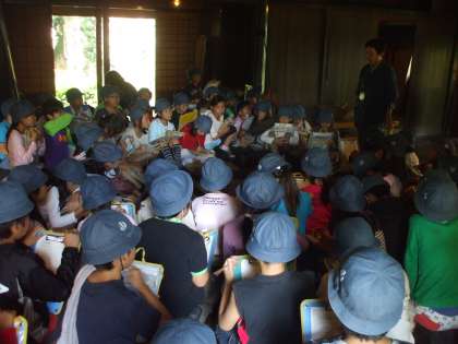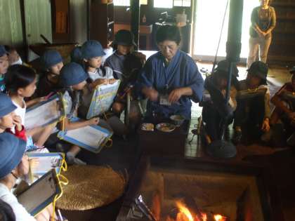 囲炉裏のそばで係の方からお話を聞きました。火を焚くことによって明かり、暖をとる。さらに煙によって茅葺きに入り込んだ虫を退治する役割があることを聞きました。そして、その頃は写真の「箱膳」というものでご飯を食べていたということも教えていただきました。