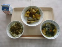 〈献立〉麦ごはん手作りかつおふりかけ牛乳めひかりのカレー揚げ肉じゃが大根のみそ汁