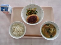〈献立〉麦ごはん牛乳もやし入りハンバーグキャベツのごまポン酢和え里いものみそ汁み...
