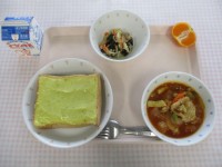 〈献立〉小松菜のクリームスパゲティ牛乳根菜チップス白菜のスープみかん