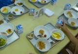 今日の給食は鮭と小松菜のご飯、牛乳、お豆腐入り和風オムレツ、アーモンド和え、大根...