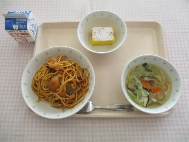 〈献立〉スパゲティナポリタン牛乳キャベツのスープかぼちゃのケーキ