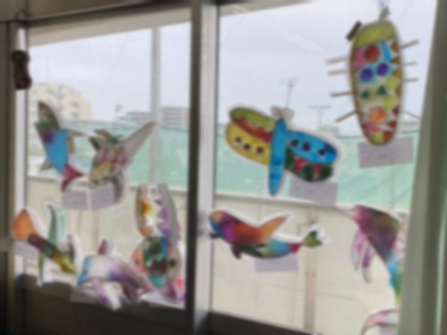 セロハンとトレーシングペーパーを使って作品作りをしました。でき上がった作品は窓に飾っています。日光が当たるとステンドグラスのように見えてきれいです。