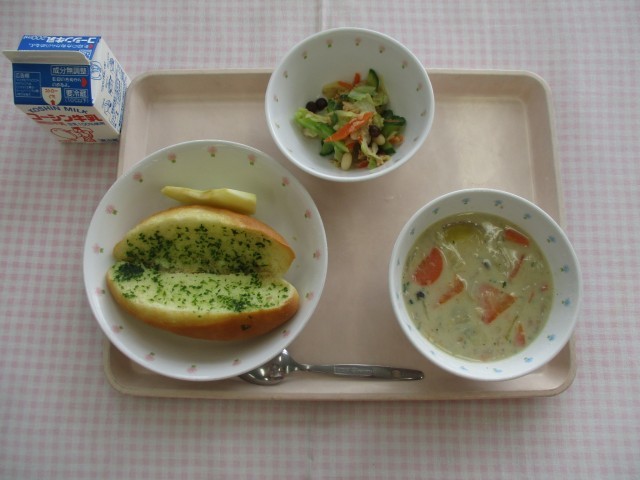 〈献立〉ガーリックフランス牛乳豆まめサラダさつまいものシチューりんご