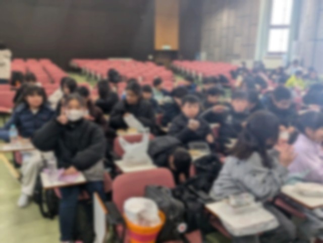 予定より少し遅れて宿舎に到着しました。到着時間の関係で開校式の前に昼食を食べています。それぞれのお弁当を友達と見せたりお話をしたり楽しげな様子です 。