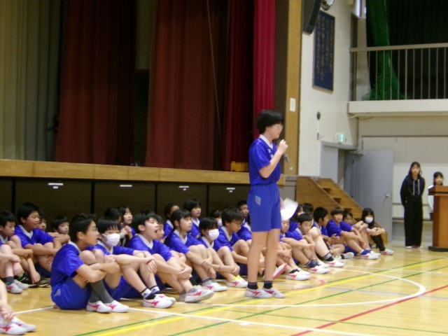 まず朝の壮行会では、ユニフォームを着た6年生が、種目ごとに意気込みを発表しました。1~5年生は、6年生に応援エールを送りました。昨日まで5年生が中心になって応援練習をしてきたので、手拍子も掛け声もよく揃っていて、6年生も嬉しそうでした。