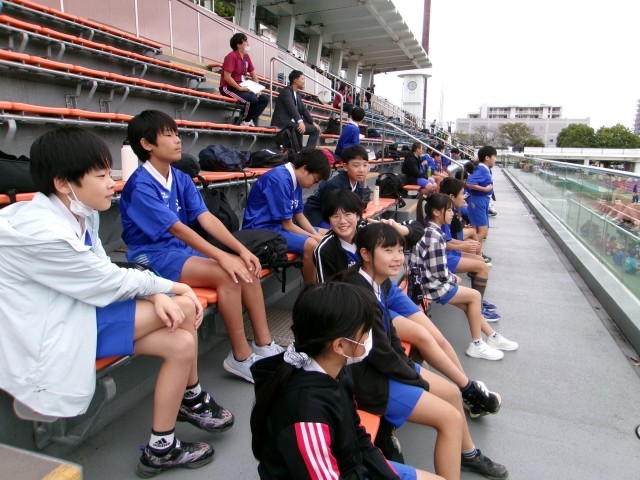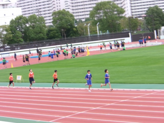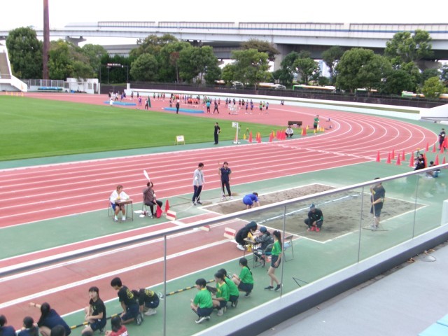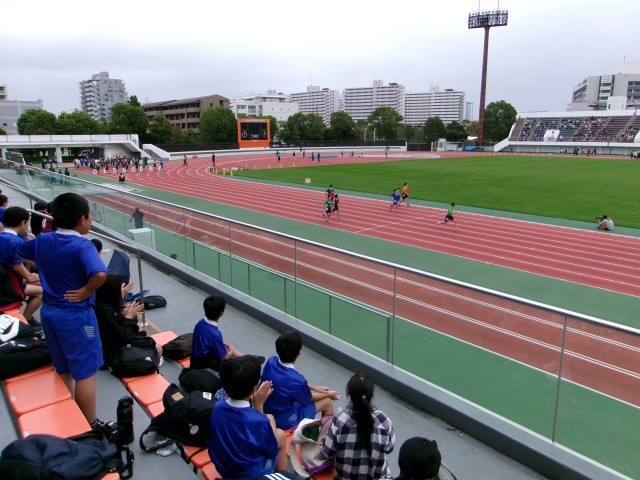 瑞江小の出場は午後の部だったので、早めにお昼を食べて区の陸上競技場へ向かいました。いつもは土の校庭で練習しているので、陸上専用の広いトラックに6年生は驚いていました。