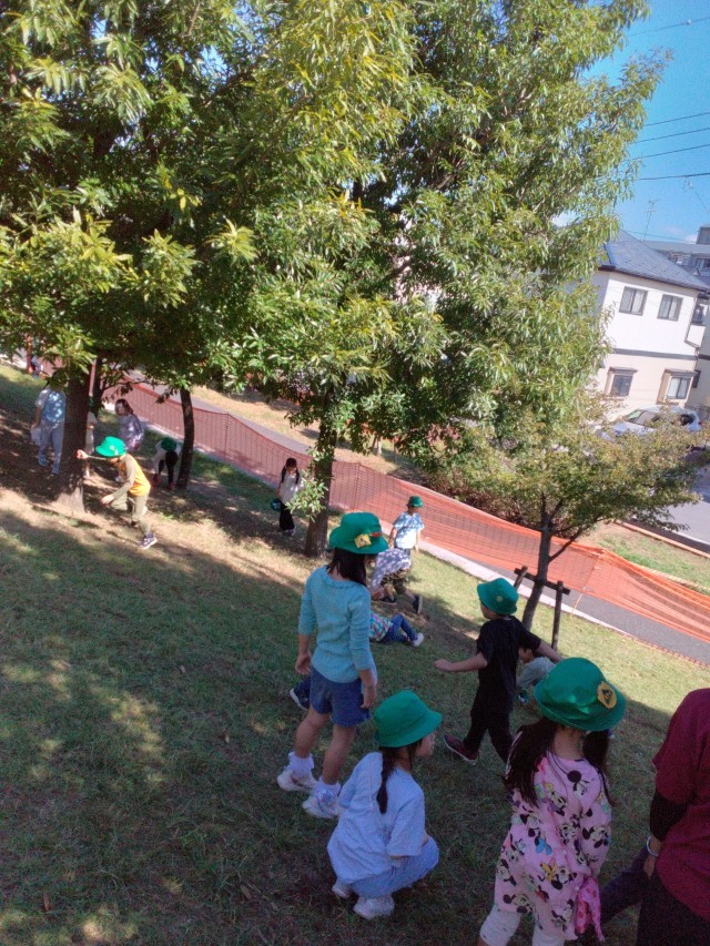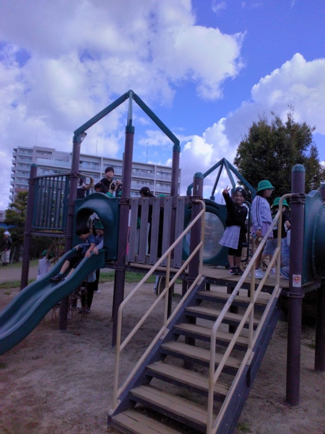 公園では、18グループに分かれ、2年生が1年生のお世話をしながら楽しく遊びます。クイズラリー、グループ遊び、遊具遊び、ドングリ拾いなど、たくさん遊びました。