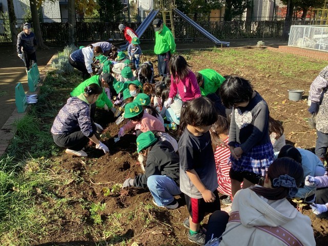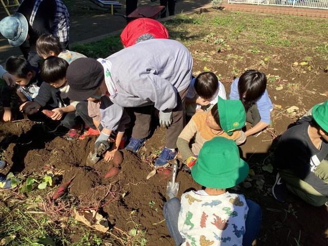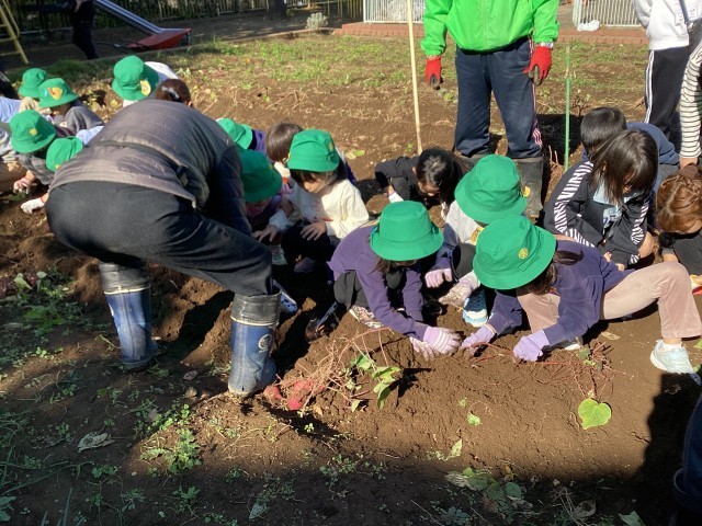 学校応援団「花ボランティア」の皆さんと一緒に、1・2年生がみずえの園でいもほりをしました。夏休み前に苗植えをしたものを花ボランティアさんが夏の間世話をしてくださり、今日のいもほりを迎えました。猛暑のせいか、若干小ぶりないもたちでしたが、土の中にいもを見つけると子どもたちは夢中で掘り出していました。