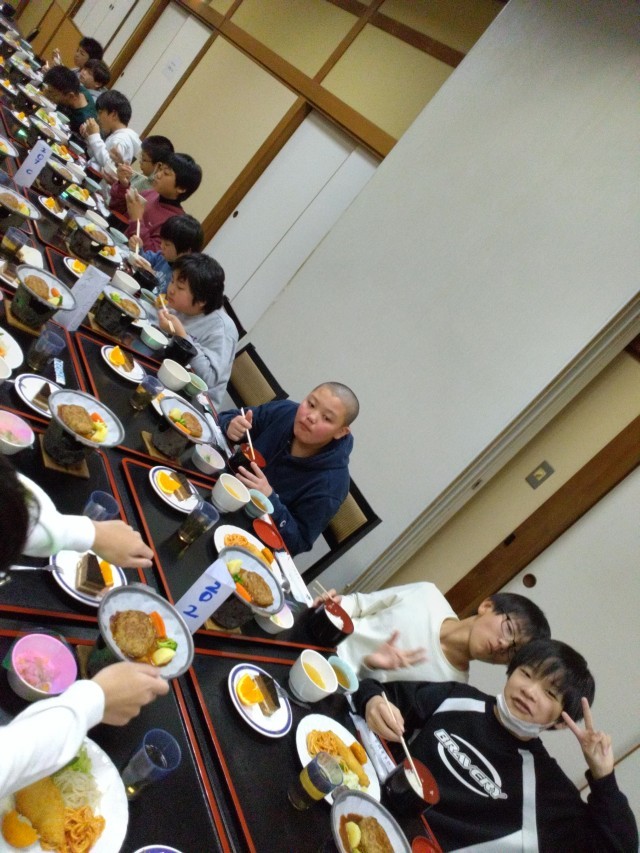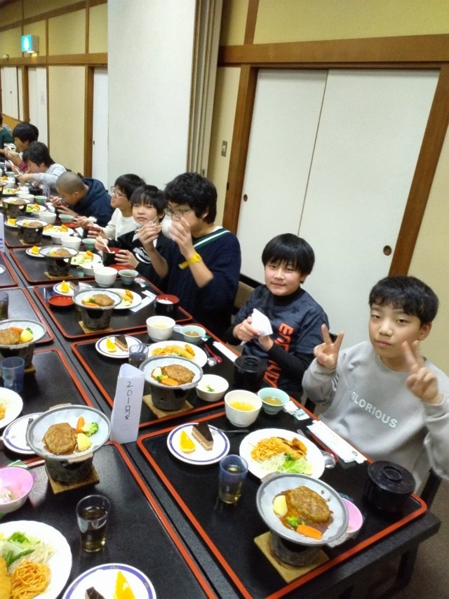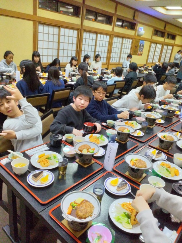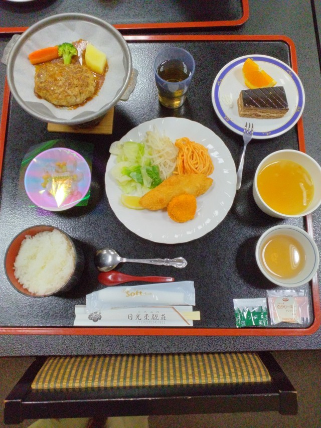 2日目の夕食は洋食、ハンバーグ、ホタテ・白身魚フライ、コンソメスープ、チョコレートケーキでした。この後のナイトツアーが気になりながら、沢山おかわりしていました。