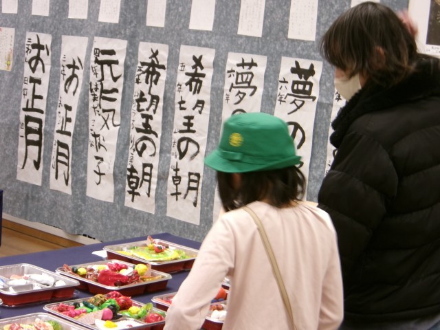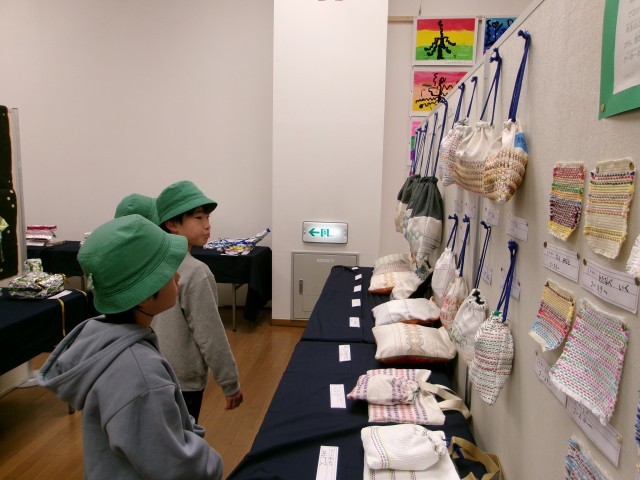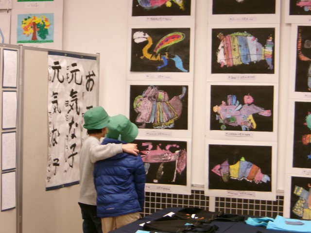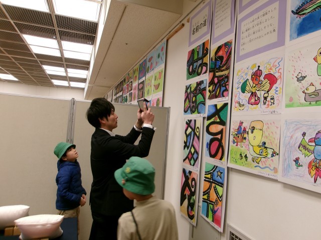 1月28日(水)タワーホール船堀で開催中の、江戸川区立小学校特別支援学級の連合展覧会に行ってきました。各校の自由で楽しい作品が、会場いっぱいに展示されていました。仲よし学級の図工作品は他校の子どもたちから人気で、スウェーデン刺繡の作品は鑑賞に来ていた大人たちに人気でした。「自分が一番気に入った作品と写真を撮る」という課題が出ていたので、みんな真剣に「お気に入り」を探しました。