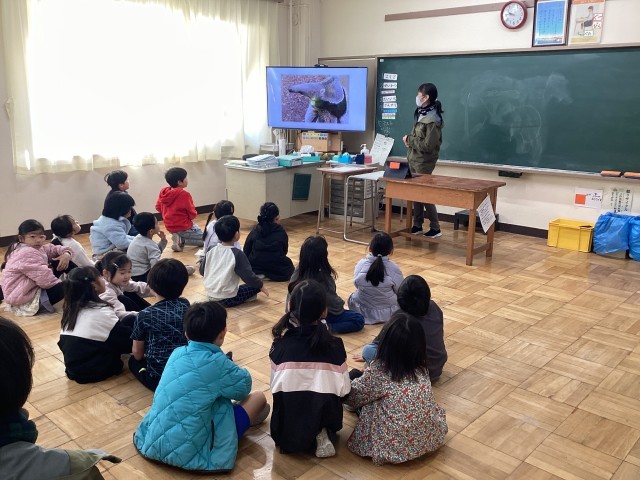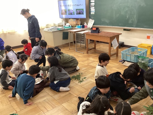 1月の2年生に続き、1年生がモルモット飼育体験をしました。行船公園にある自然動物園の皆さんが来校して、モルモットをはじめいろいろな動物の話をした後、本物のモルモットに触れてなでたりエサの笹の葉をあげたりしました。普段はやんちゃな子も、モルモットをそーっと抱いて優しく接していました。