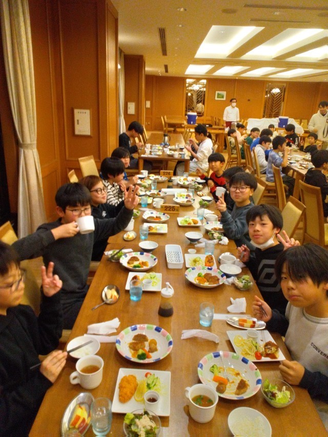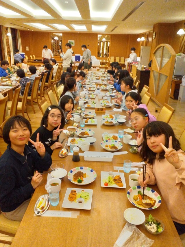 夕食の時間です。食事係が準備をして、美味しいご飯が整いました。お米は魚沼産のコシヒカリ、ここでしか食べられない塩沢米です。おかわりが続出して、お腹いっぱい食べました。