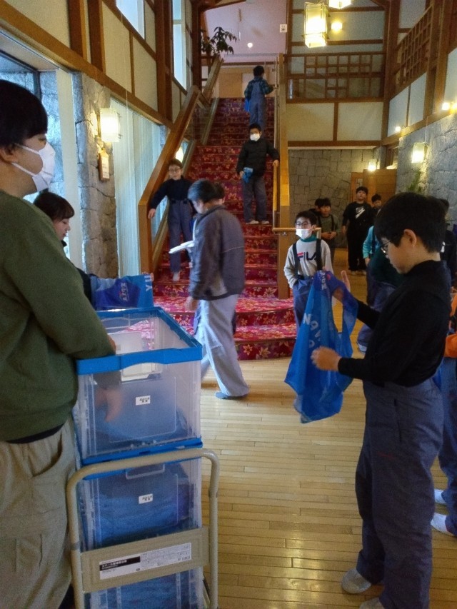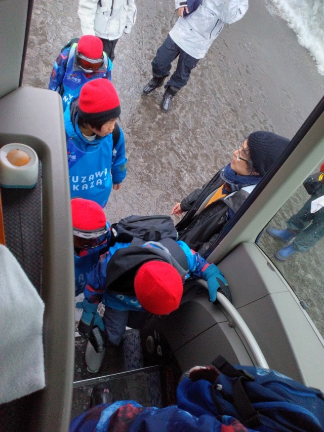 スキー用のビブスを着けて、これからバスで中里スキー場へ向かいます。宿舎の方も「これくらいの雪なら大丈夫」と言ってくださいました。楽しみです。