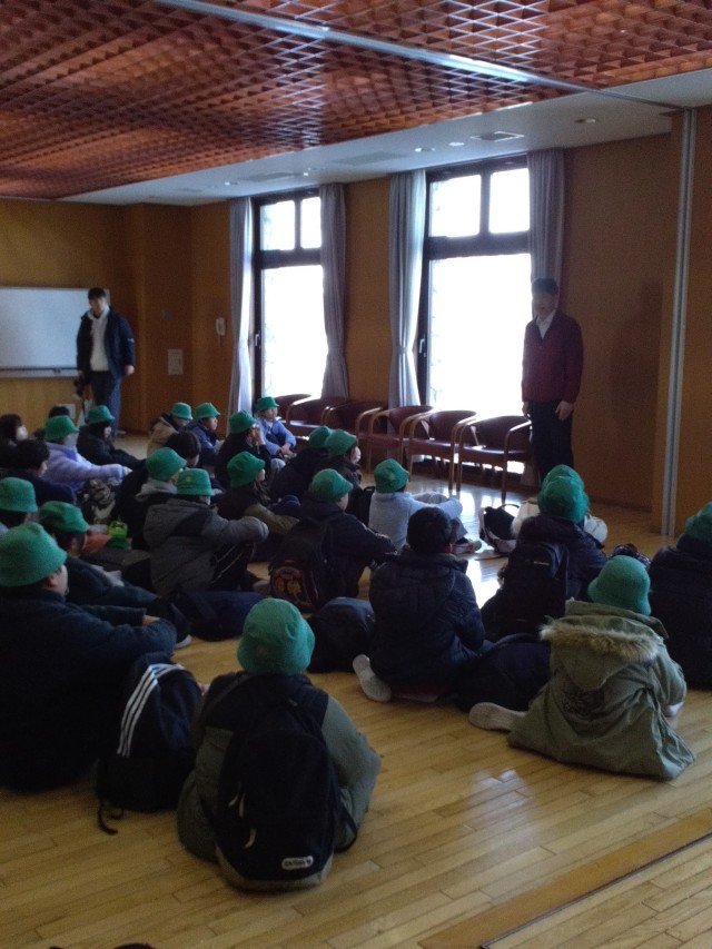 閉校式で、みんなで宿舎の方にお礼を伝えました。きれいな部屋、素晴らしいお風呂、美味しいご飯、スタッフの方の心遣いなど、感謝することばかりです。来たときよりも綺麗に片付けて、宿舎を出発しました。