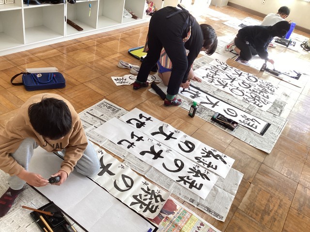 先週の低学年・高学年、昨日の中学年に続いて、今日は仲よし学級の席書会がありました。仲よしの教室で1・2年生は硬筆、3年生以上は毛筆の書き初めをしました。手本をよく見て、一生懸命にきれいな字を書いていました。どれを作品として提出しようかと、先生たちと相談している様子も見られました。