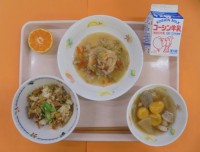 10月6日の献立は、・吹き寄せご飯・牛乳・揚げ豆腐の野菜あんかけ・かぼちゃの白玉...
