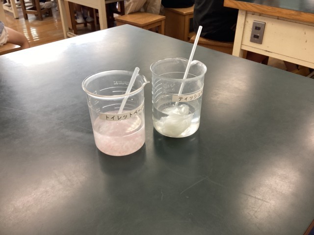 トイレをイメージして、トイレットペーパーとティッシュを水の中でかき混ぜる実験をしました。