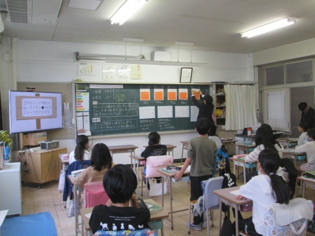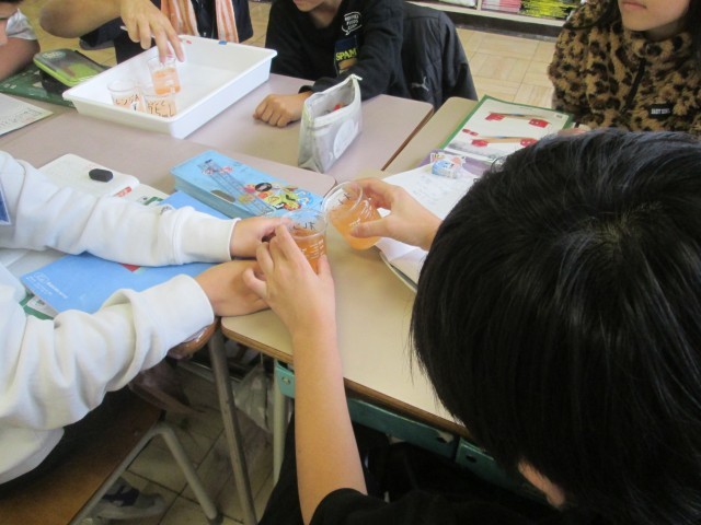 自分の考えを話したり友達の考えを聞いたりした後、オレンジジュースを操作して考えを確かめ合うことができました。
