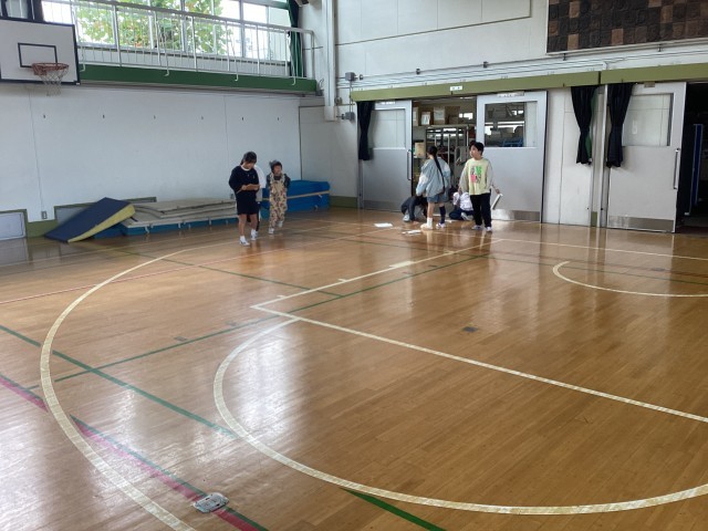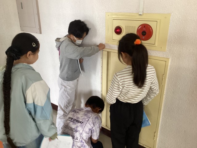 友だちと協力しながら体育館の床や消火栓の扉の長さを測り、楽しそうに公式を使って面積を求める姿が見られました。