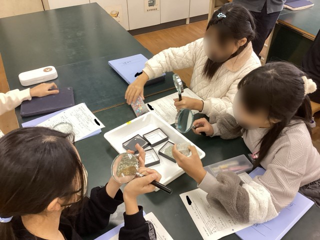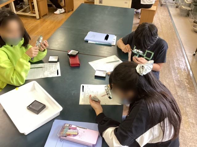 6学年の理科では、地層について学習しています。今回は、地層を形づくっている堆積岩を観察しました。