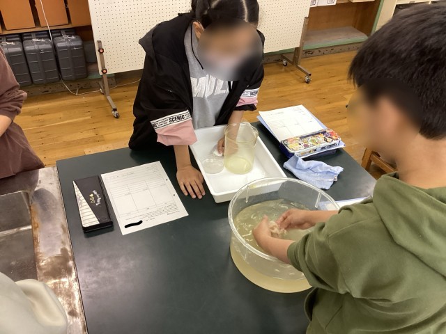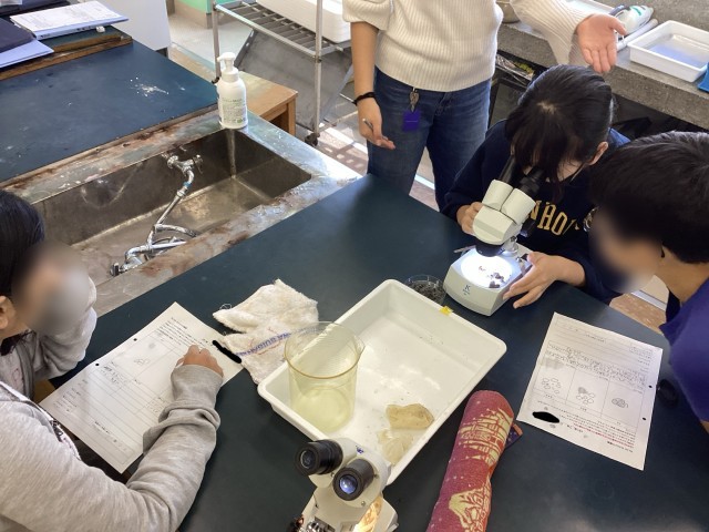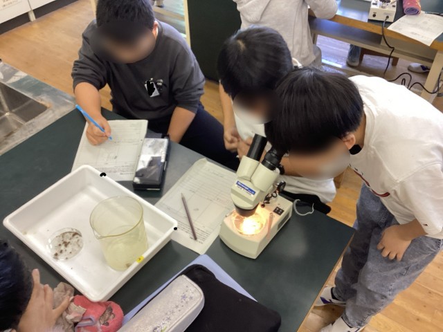 理科の授業では地層について学習しています。今回は、校庭のれきと土中(園芸用の鹿沼土、赤玉土)に含まれる火山灰を取り出して顕微鏡で観察しました!