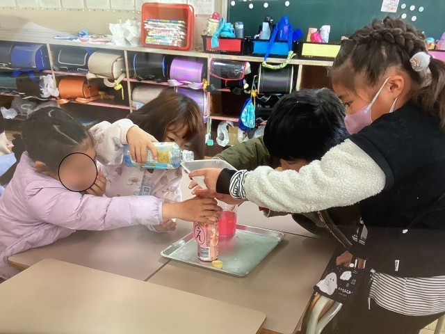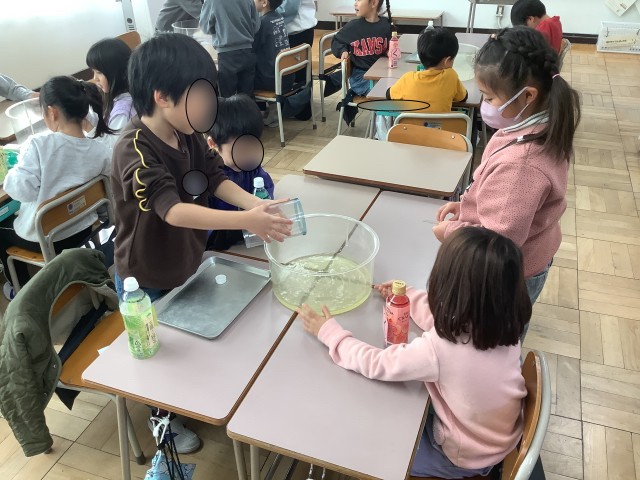 違うペットボトルに入ってる色水の量をどう比べるか、みんなで考えました。