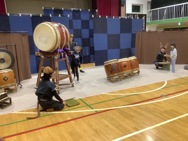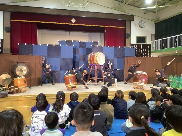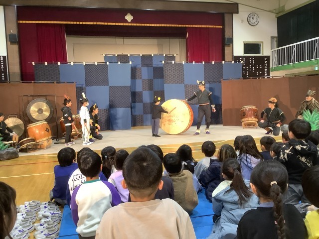 ユーモアが溢れるお芝居と迫力満点の太鼓パフォーマンスに児童たちもすっかり夢中でした。