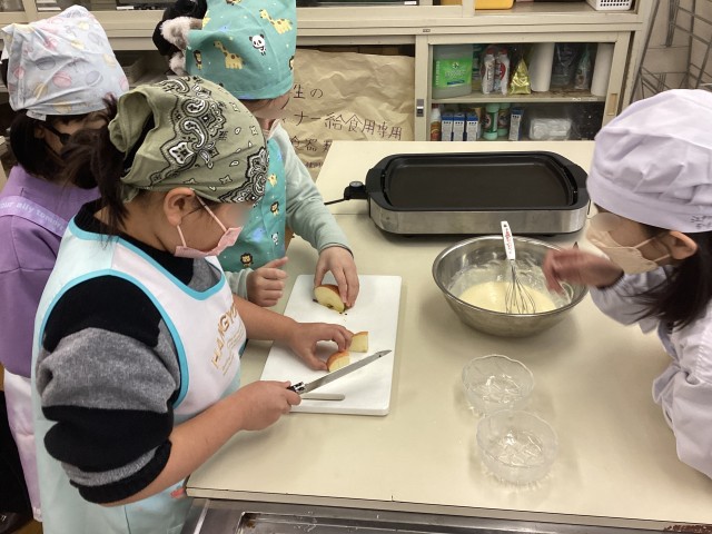 包丁でリンゴやバナナを切ったり、ホットプレートの火加減に気を付けてパンケーキを焼いたり、安全に気を付けて活動することができました。