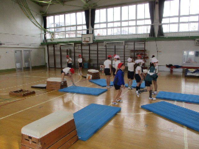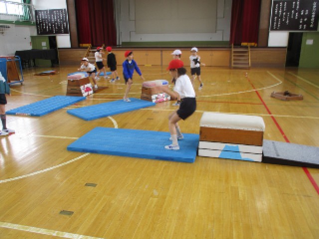 体育の授業で、跳び箱運動に取り組んでいます。開脚跳びや台上前転など、1・2年生の時よりも一歩進んだ技に取り組んでいます。スモールステップで恐怖心を減らして、自分に合った跳び箱で練習をしています。