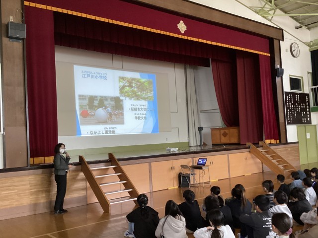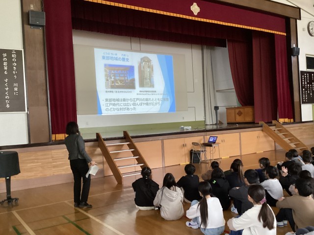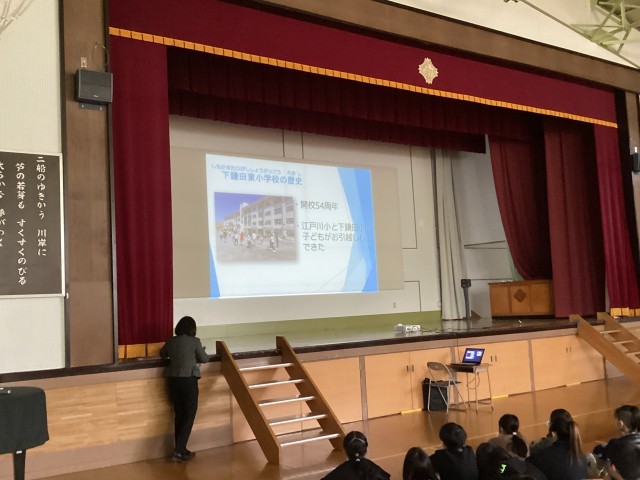 学校統合に向けて、地域、江戸川小、下鎌田東小の歴史などについて校長先生が紹介しました。とくに、これから統合する下鎌田東小について歴史だけでなく、行事なども紹介しました。