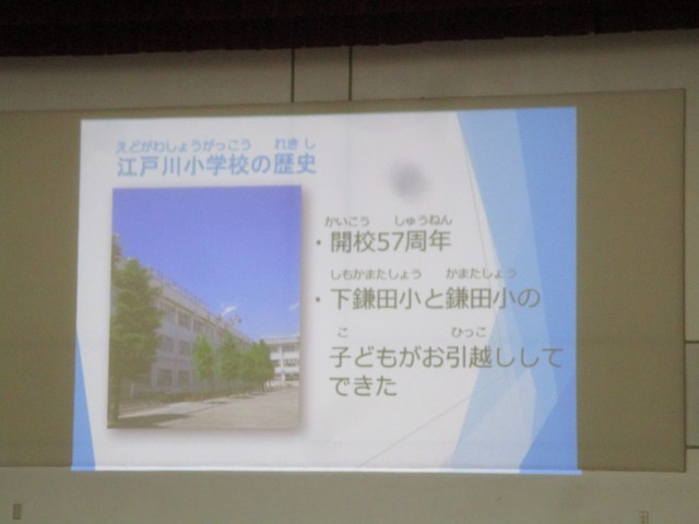 江戸川小学校と下鎌田東小学校の統合に向けて、校長先生から2校の歴史や学校についての話がありました。統合したときの学校の名前を考えて、投票箱に投票するようにします。どんな名前が出てくるのか、楽しみですね。
