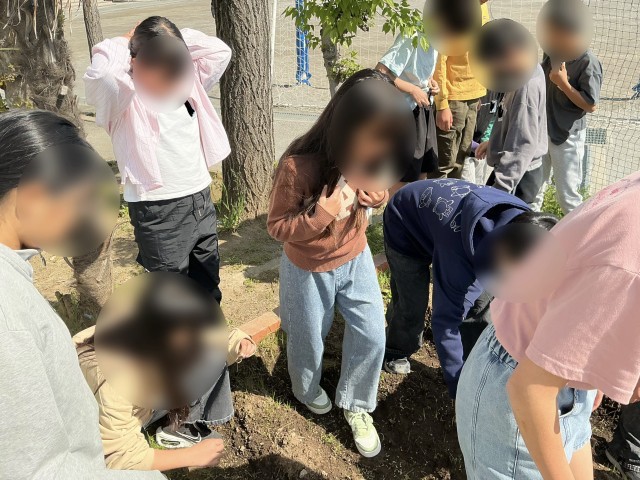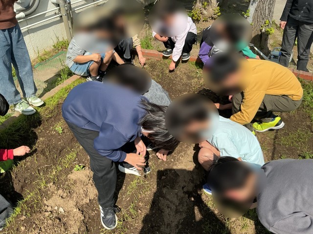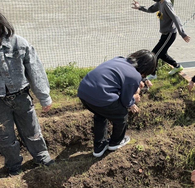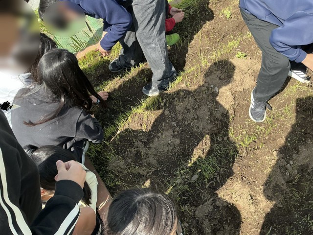 現在、6年生では6月の実験に向けてジャガイモを育てています。2組のメンバーは放課後水やりをしています。今回は、畑の雑草抜きをしました!