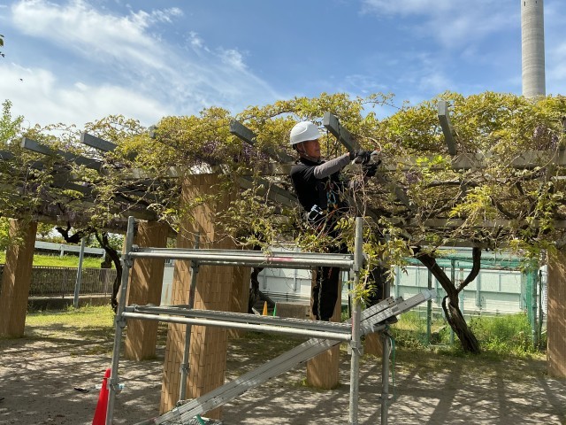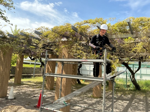 今日は、高橋さんが藤棚を整備してくださっています。毎年、年2回季節に合わせて選定してくださいます。お話ししたところ造園についてまだまだ勉強を続けていることや社会貢献として江戸川小学校の藤棚を整備し続けている話を伺うことができました。おかげさまで、綺麗に咲いています。高橋さん、いつもボランティアをしてくださっているみなさま、ありがとうございます。