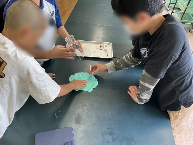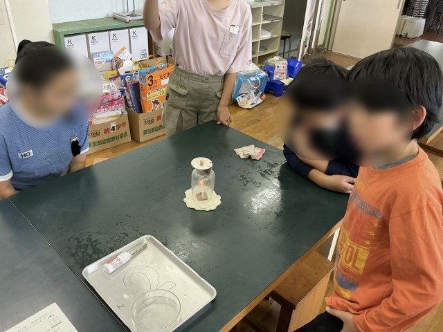 今回の理科は、前回実験した「集気びんに入れたろうそくの燃えるようすを確かめる」から発展させ、どのように工夫したら燃える時間が長くなるかについて調べました。自分たちで実験方法を考え、実験しました!
