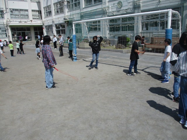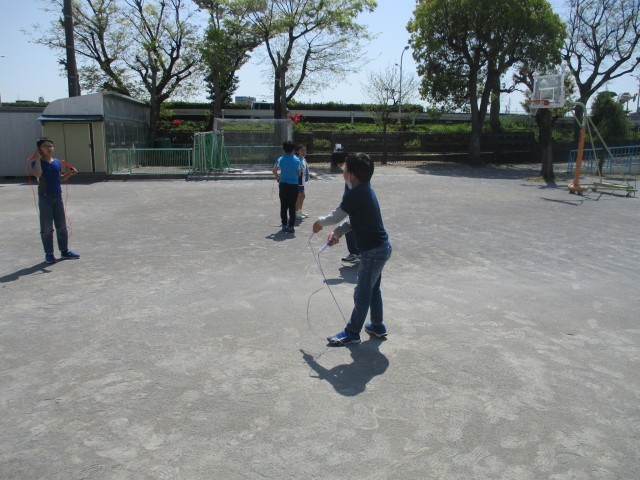 今年度から、1学期に一回、なわ跳びチャレンジウィークがあります。なわ跳びカードに書かれている技が、一つでもできるようになったり、回数が増えるようにしたりできるように頑張ります!なわ跳びの持ち方や跳び方の確認をして、一人ひとりが自分のめあてに向けて練習していきます!友達と教え合ったりする子もいて、楽しく取り組んでいました。