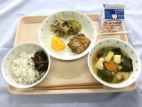 今日の給食は、出世魚の「ブリ」を使った照り焼きを中心に、「じゃことひじきのふりかけ付きごはん」「小松菜とサツマイモのピリ辛和え」「豆腐と麩のかきたま汁」「オレンジ」に「牛乳」を添えました。