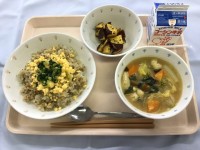 今日の給食は、ニンジンや小松菜、ジャガイモやたまごなどを使った、見た目も鮮やかな献立です。