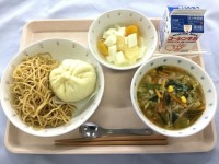 今日の献立は、「鯖の辛子醤油かけ」「五色和え」「胡麻みそけんちん汁」「鶏そぼろ付きごはん」と「牛乳」です。