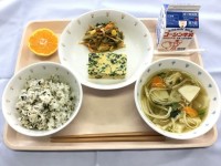 今日の献立は、「きのこピラフ」「トマトとじゃがものスープ」「レバーのガーリック揚げ」「アサリと