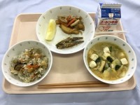 今日の給食は和食です。献立は「ホキのあずま煮」「千草和え」「わかめごはん」「沢煮椀」と「牛乳」です。「沢煮椀」には、大根やニンジン、ゴボウなどの根菜類を細切りにして、肉や魚介などと合わせ煮た汁物です。