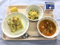 今日のメニューは、大豆入りドライカレー、キャベツとコーンのサラダ、フルーツポンチ、牛乳でした。