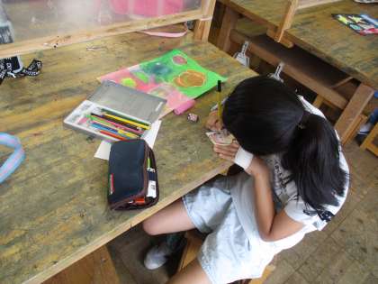 先日の図工での様子です。クレヨンや絵の具を使って素敵な作品を作っています。