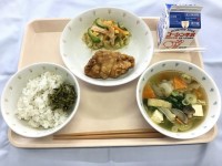 その他、ますの塩こうじ焼き西京みそかけ、キャベツと小松菜のおひたし、のっぺい汁、ごまじゃこごはん、牛乳でした。