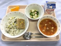 今日の給食には、昨日のSDGs給食にもあった切干大根を使った「ハリハリ和(あ)え」がありました。少し酸味をきかせて、もやしやにんじん、小松菜などと和えた、食べやすい一品でした。