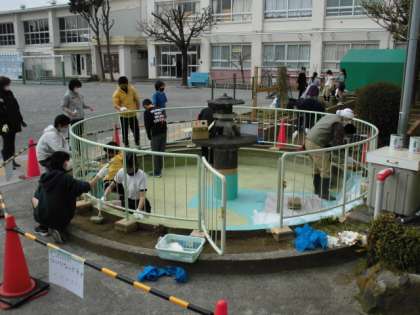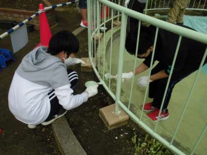 3月、卒業を間近に控えた6年生児童が、学校のために何かできることはないかと、自分たちで考えを出し合い、校庭の遊具のペンキ塗りやビオトープの整備を計画しました。この日は校庭の丸池の柵のペンキ塗りをしました。主事さんにやり方を教わり、一塗り一塗り丁寧に仕上げました。6年生児童の「6年間お世話になりました」という感謝の気持ちが表れた素敵な時間でした。