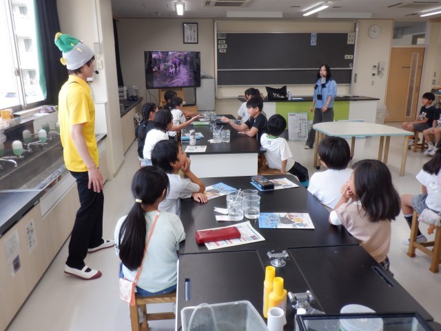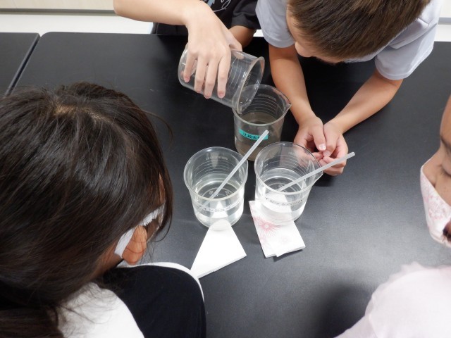 ビーカーで沈殿の実験を行ったり、トイレットペーパーとティッシュペーパーを水で溶かしたりしました。