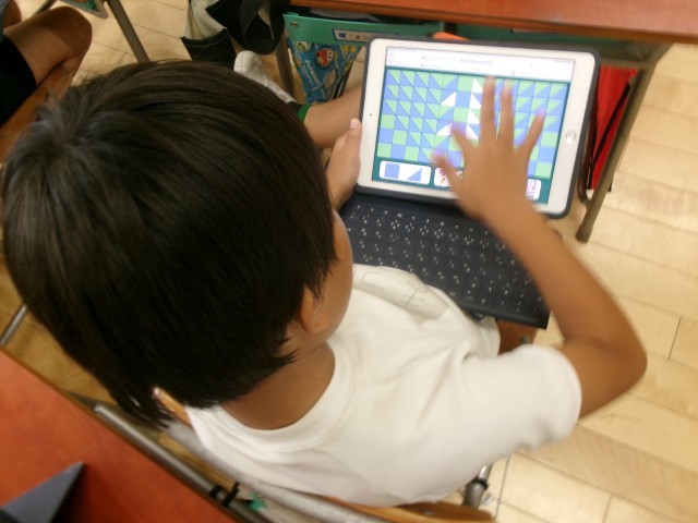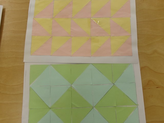 直角三角形と正方形を敷きつめて、模様づくりをしました。